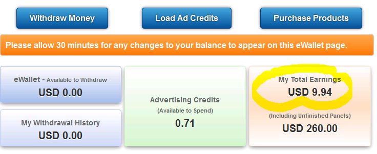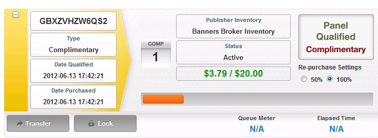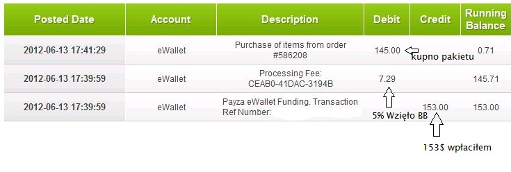 Wpłaciłem za pośrednictwem payza 153$ do BB. Musimy brać pod uwagę to, że 5% BannersBroker bierze za wykonanie operacji, dlatego żeby wykupić pakiet za 145$ wpłaciłem 153$. 7.29$ to właśnie to 5%. Zostało 145.71$, więc wykupiłem pakiet niebieski za 145$. Panele pojawiły się po ok. 20 minutach i były już zakwalifikowane. Do dzisiaj (3 dni od wykupienia pakietu) mam prawie 10$ ale to dopiero początek. Za kilka dni znowu zaprezentuję mój zarobek, oraz moje posunięcia w BB. Poniżej zarobek przez 3 dni, gdzie wartość pod zarobkiem to kwota jaką zarobię po zamknięciu paneli: