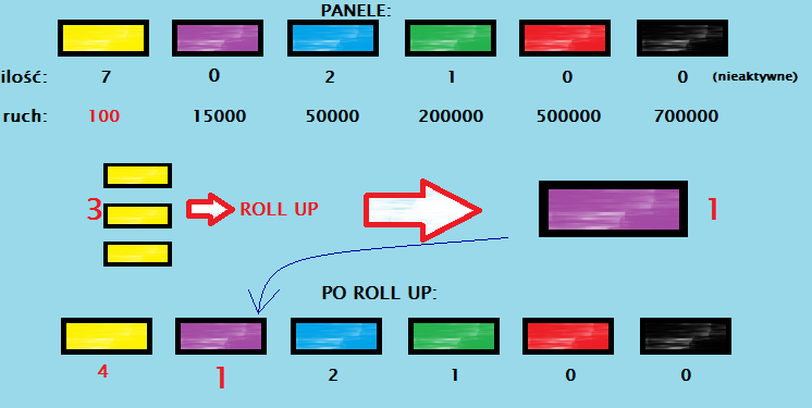 Jak widać na obrazku powyżej, zrolowaliśmy 3 niezakwalifikowane panele koloru żółtego w jeden panel koloru fioletowego. (Pamiętaj także, że rolowanie polega na połączeniu 3paneli koloru niższego w jeden koloru wyższego). Dokonaliśmy takiej operacji, ponieważ nie posiadaliśmy ruchu na "odpalenie" żadnego panelu koloru żółtego. Aktualnie zniknęły nam 3 panele żółte i pojawił się nam jeden koloru fioletowego.